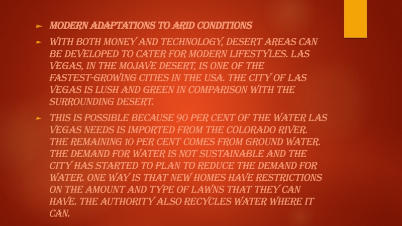This is possible because 90 per cent of the water Las Vegas needs is imported from the Colorado River. The remaining 10 per cent comes from ground water. The demand for water is not sustainable and the city has started to plan to reduce the demand for water. One way is that new homes have restrictions on the amount and type of lawns that they can have. The authority also recycles water where it can.