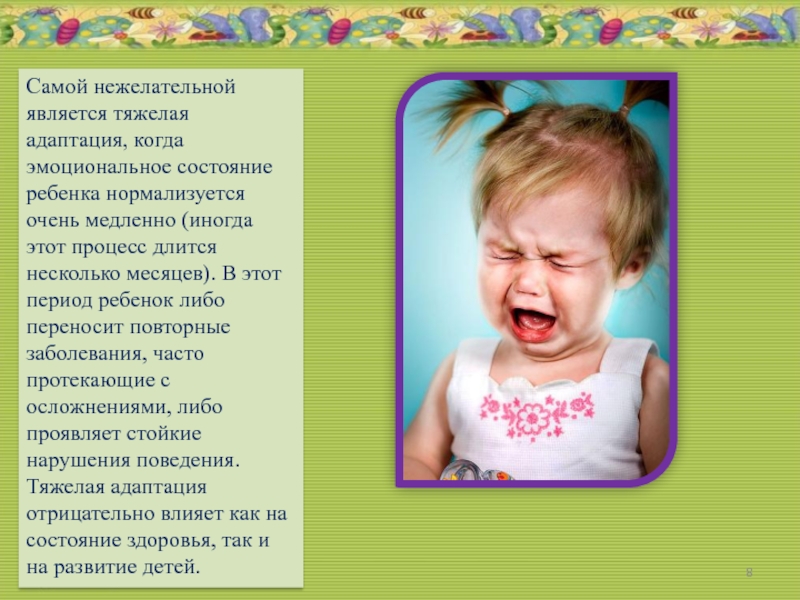 Слайд 8Самой нежелательной является тяжелая адаптация, когда эмоциональное состояние ребенка нормализуется