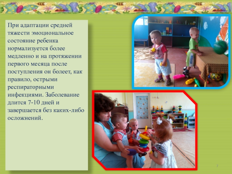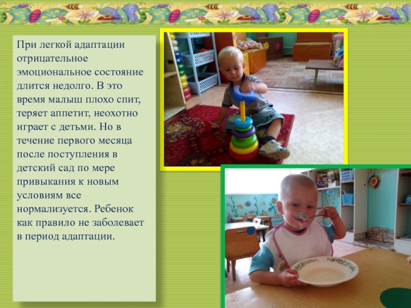 Слайд 7При адаптации средней тяжести эмоциональное состояние ребенка нормализуется более медленно