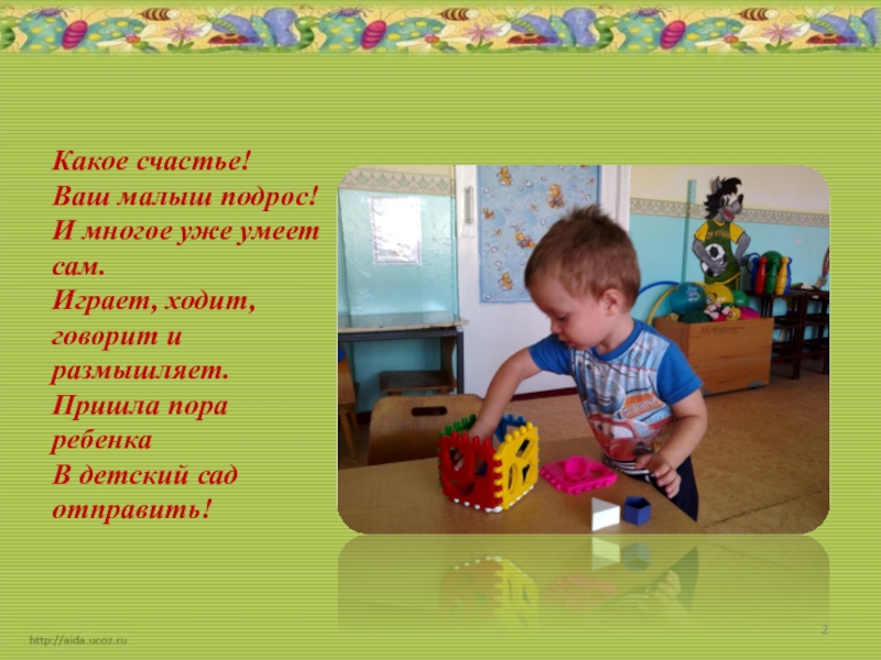 Расскажите родным и знакомым в присутствии ребёнка, что вы уже ходите в детский сад. Какой он молодец. Ведь он теперь взрослый, совсем как мама и папа ходит на работу. В детском саду тебе будет интересно, ты познакомишься и подружишься с другими ребятами и взрослыми. Утром я тебя отведу в детский сад, а вечером заберу. Ты мне расскажешь, что у тебя было интересного, что ты узнал нового.