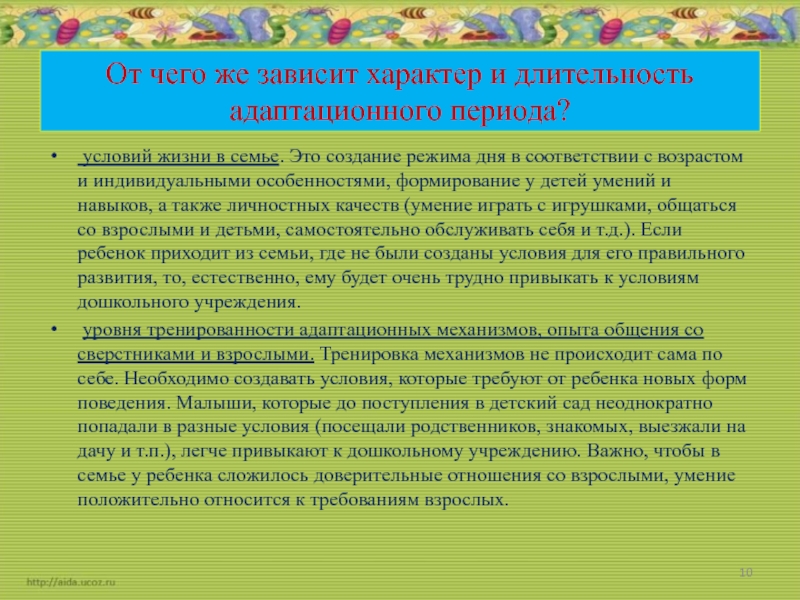 Слайд 10От чего же зависит характер и длительность адаптационного периода?