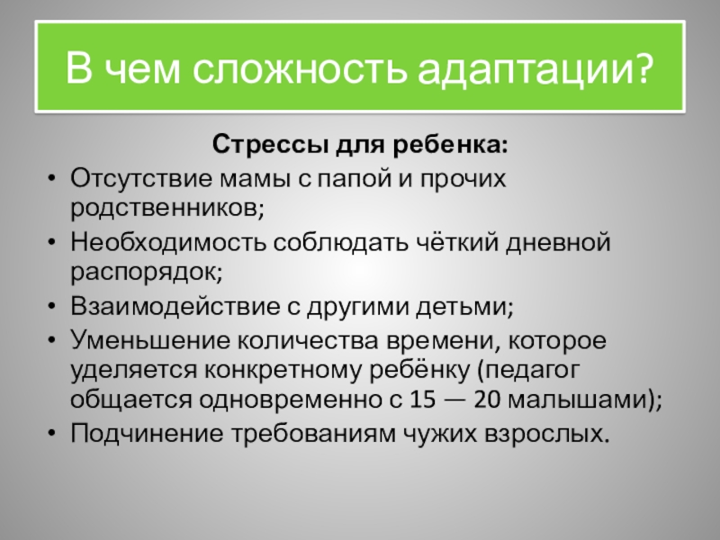 времени, которое уделяется конкретному ребёнку (педагог общается одновременно с 15 — 20 малышами);