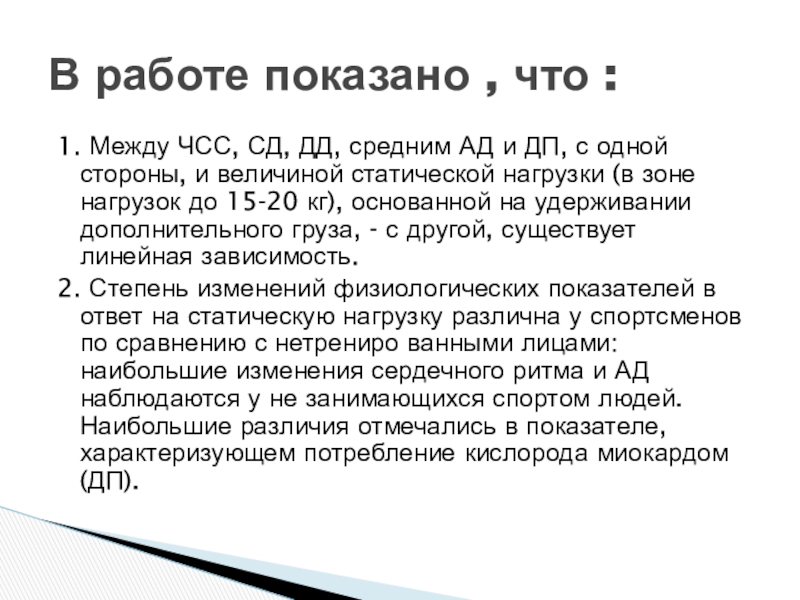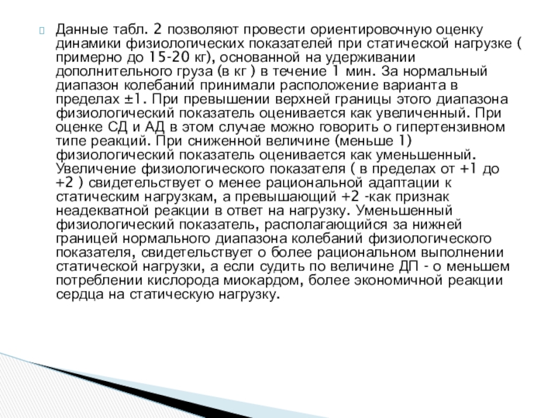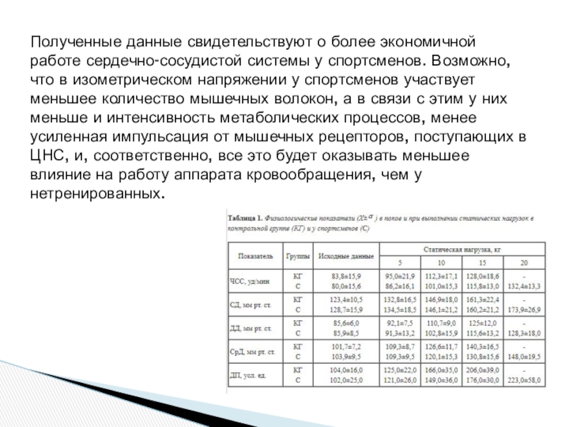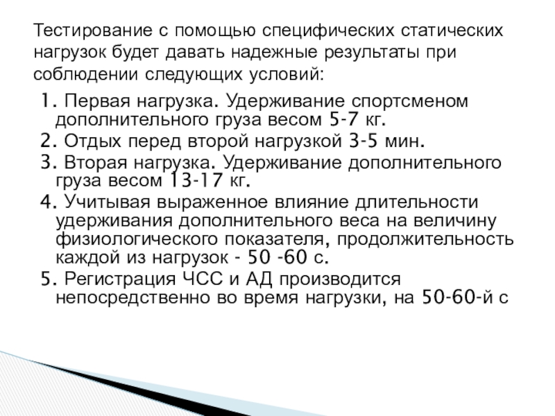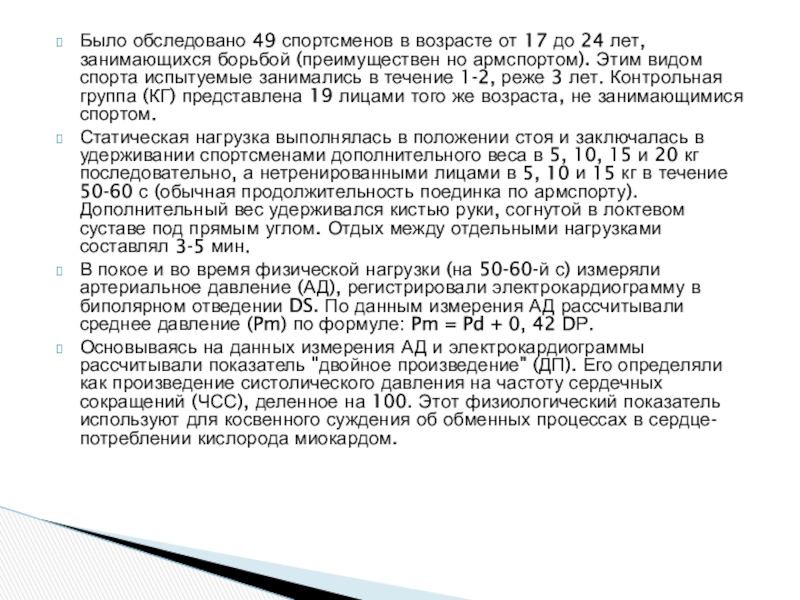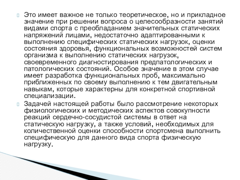 значительных статических напряжений лицами, недостаточно адаптированными к выполнению специфических статических нагрузок, оценки состояния здоровья, функциональных возможностей систем организма к выполнению статических нагрузок, своевременного диагностирования предпатологических и патологических состояний. Особое значение в этом случае имеет разработка функциональных проб, максимально приближенных по своему выполнению к тем двигательным навыкам, которые характерны для конкретной спортивной специализации.Задачей настоящей работы было рассмотрение некоторых физиологических и методических аспектов совокупности реакций сердечно-сосудистой системы в ответ на статическую нагрузку, а также условий, необходимых для количественной оценки способности спортсмена выполнить специфическую для данного вида спорта физическую нагрузку.