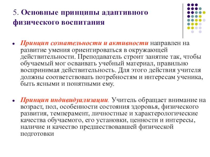 Принцип индивидуализации. Учитель обращает внимание на возраст, пол, особенности состояния здоровья, физического развития, темперамент, личностные и характерологические качества обучаемого, его установки, ценности и интересы, наличие и качество предшествовавшей физической подготовки