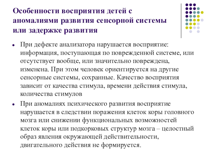 При аномалиях психического развития восприятие нарушается в следствии поражения клеток коры головного мозга или снижении функциональных возможностей клеток коры или подкорковых структур мозга – целостный образ явления окружающей действительности, двигательного действия не формируется.