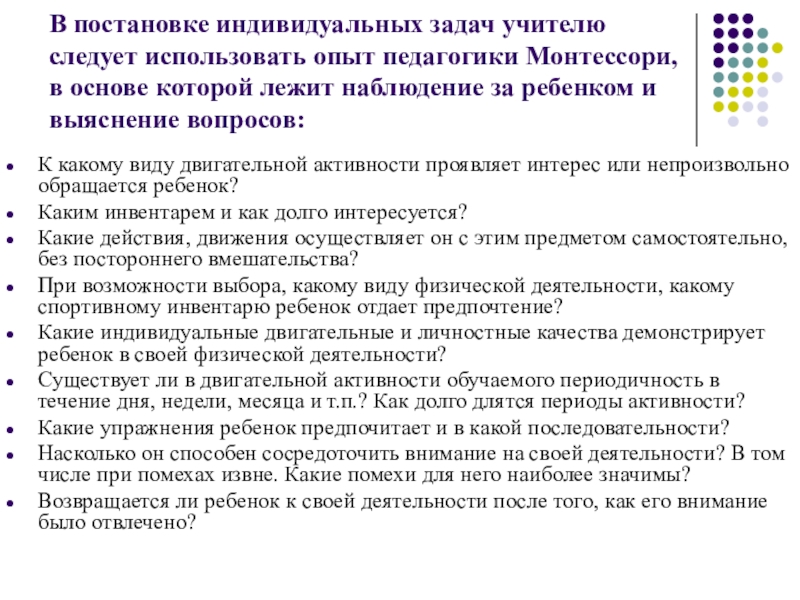 Слайд 10В постановке индивидуальных задач учителю следует использовать опыт педагогики Монтессори,