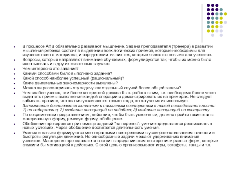 Слайд 21В процессе АФВ обязательно развивают мышление. Задача преподавателя (тренера) в