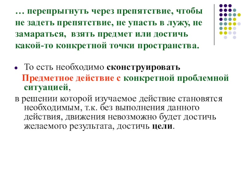 создать для него проблемную ситуацию и предметное действие, т.е. обозначить предмет, достижение которого будет необходимо, к которому будет выполняться осваиваемое действие (сюжет), в котором обозначенный предмет становится целью достижения. Например: прыгать в длину необходимо, чтобы …
