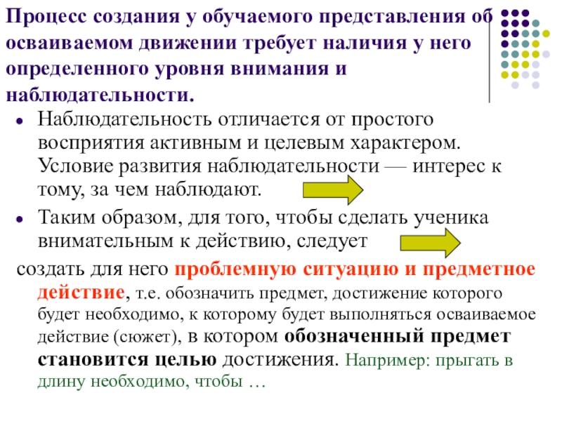 Слайд 18Процесс создания у обучаемого представления об осваиваемом движении требует наличия