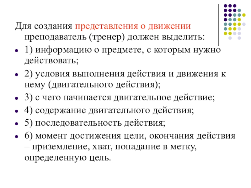 Слайд 20Для создания представления о движении преподаватель (тренер) должен выделить: