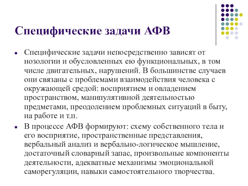 В процессе АФВ формируют: схему собственного тела и его восприятие, пространственные представления, вербальный анализ и вербально-логическое мышление, достаточный словарный запас, произвольные компоненты деятельности, адекватные механизмы эмоциональной саморегуляции, навыки самостоятельного творчества.