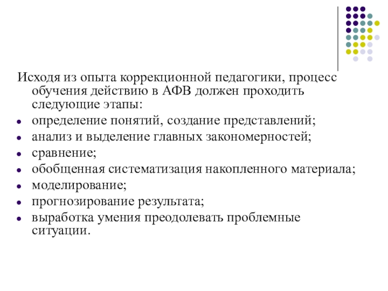 Слайд 15Исходя из опыта коррекционной педагогики, процесс обучения действию в АФВ