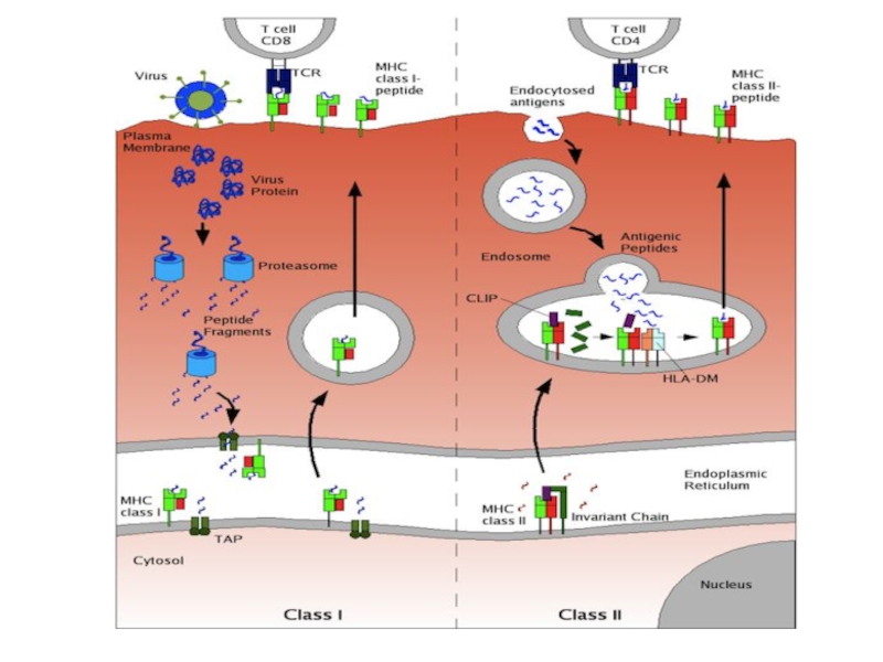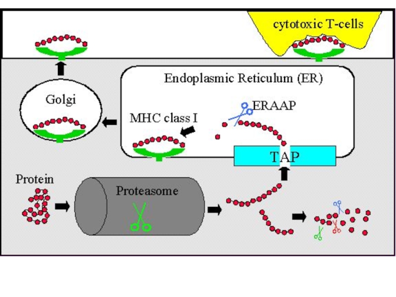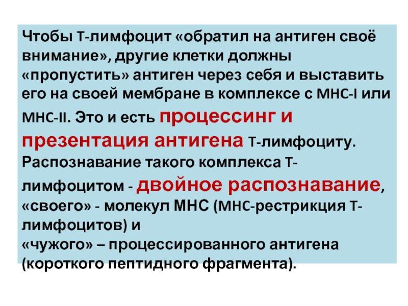 в комплексе с MHC-I или MHC-II. Это и есть процессинг и презентация антигена T-лимфоциту. Распознавание такого комплекса T-лимфоцитом - двойное распознавание, «своего» - молекул МНС (MHC-рестрикция T-лимфоцитов) и