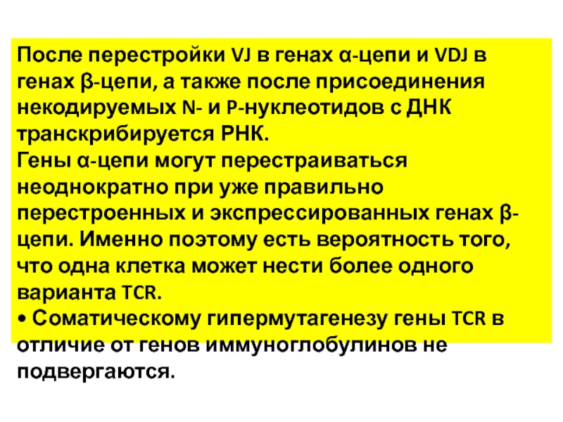 • Соматическому гипермутагенезу гены TCR в отличие от генов иммуноглобулинов не подвергаются.