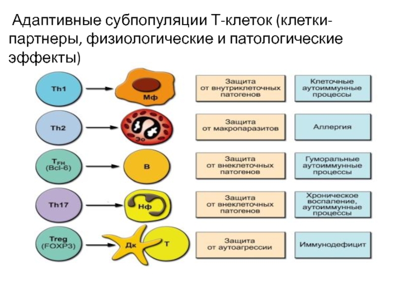 Слайд 28 Адаптивные субпопуляции Т-клеток (клетки-партнеры, физиологические и патологические эффекты)