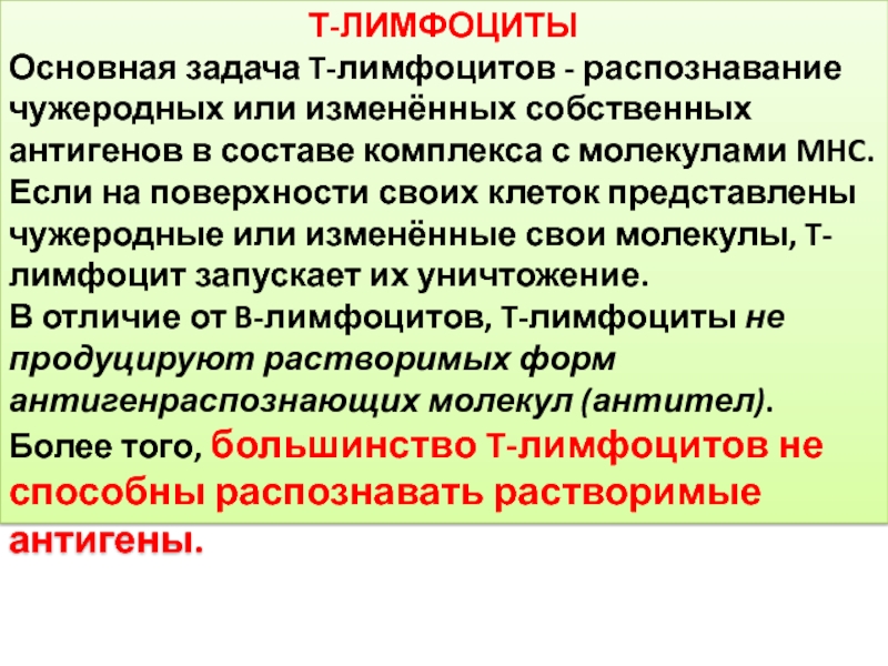 В отличие от B-лимфоцитов, T-лимфоциты не продуцируют растворимых форм антигенраспознающих молекул (антител). Более того, большинство T-лимфоцитов не способны распознавать растворимые антигены.