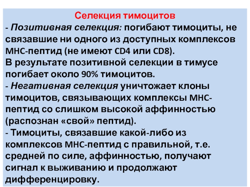 - Негативная селекция уничтожает клоны тимоцитов, связывающих комплексы MHC-пептид со слишком высокой аффинностью (распознан «свой» пептид).