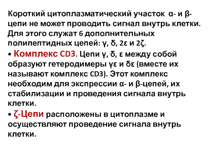 CD3. Цепи γ, δ, ε между собой образуют гетеродимеры γε и δε (вместе их называют комплекс CD3). Этот комплекс необходим для экспрессии α- и β-цепей, их стабилизации и проведения сигнала внутрь клетки.