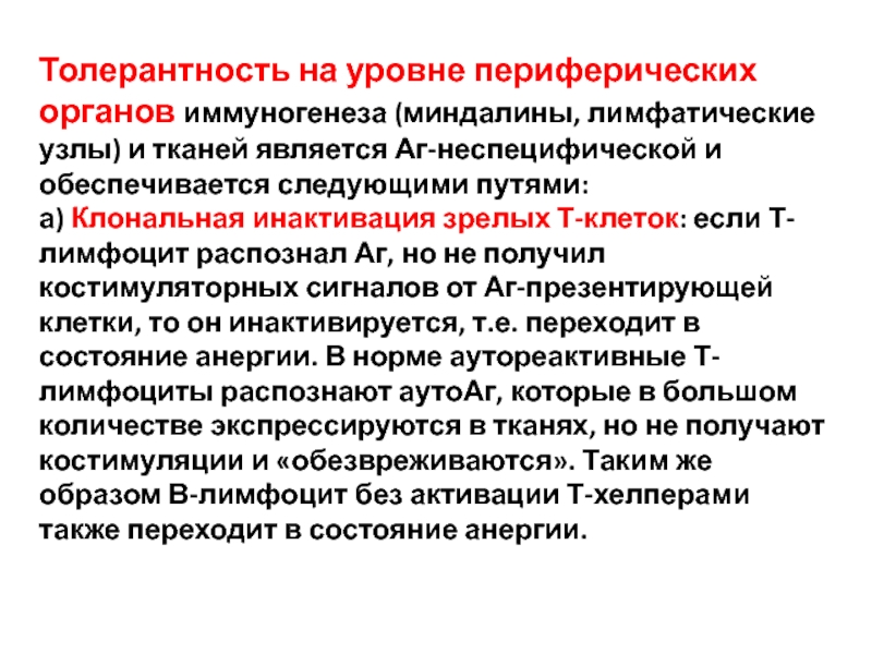 Слайд 32Толерантность на уровне периферических органов иммуногенеза (миндалины, лимфатические узлы) и