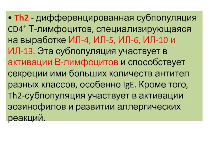 Слайд 23• Th2 - дифференцированная субпопуляция CD4+ Т-лимфоцитов, специализирующаяся на выработке ИЛ-4, ИЛ-5, ИЛ-6,