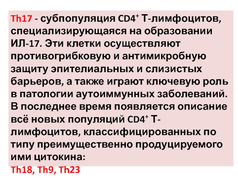 Слайд 25Th17 - субпопуляция CD4+ Т-лимфоцитов, специализирующаяся на образовании ИЛ-17. Эти клетки осуществляют
