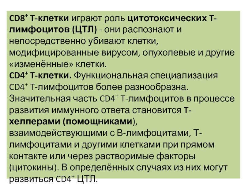 Слайд 19CD8+ T-клетки играют роль цитотоксических T-лимфоцитов (ЦТЛ) - они распознают и непосредственно