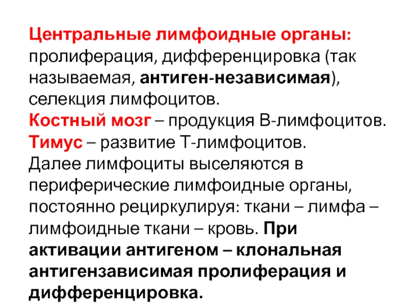 Слайд 2Центральные лимфоидные органы: пролиферация, дифференцировка (так называемая, антиген-независимая), селекция лимфоцитов.