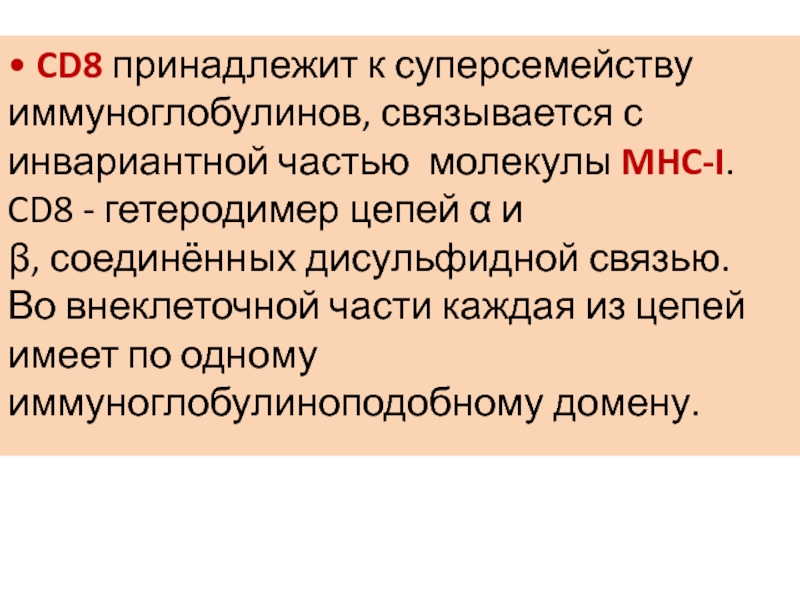 Слайд 12• CD8 принадлежит к суперсемейству иммуноглобулинов, связывается с инвариантной частью молекулы MHC-I.