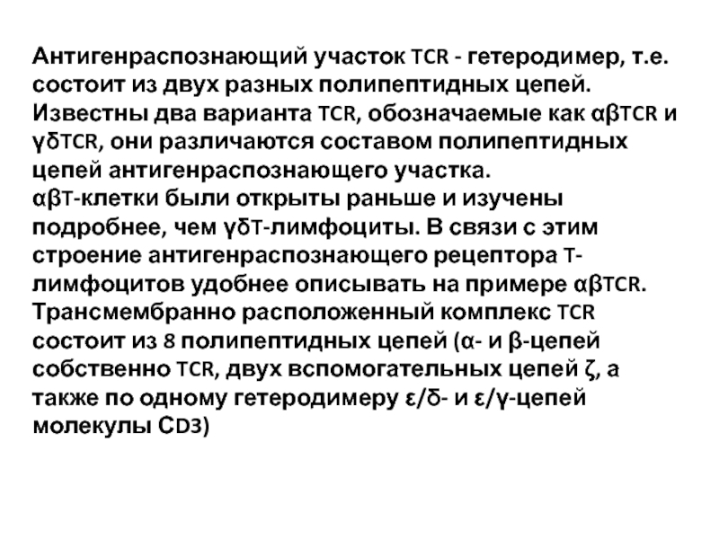 Слайд 9Антигенраспознающий участок TCR - гетеродимер, т.е. состоит из двух разных