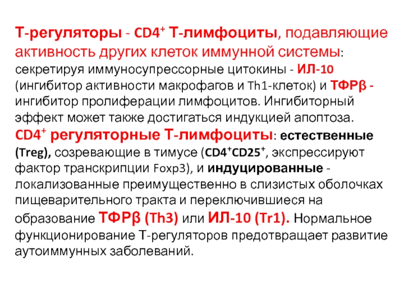 Слайд 27Т-регуляторы - CD4+ Т-лимфоциты, подавляющие активность других клеток иммунной системы: секретируя иммуносупрессорные