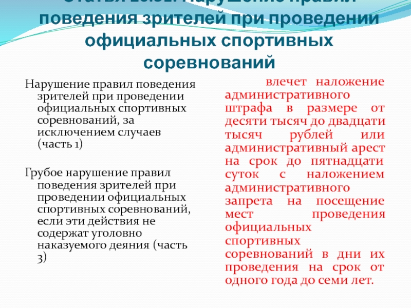влечет наложение административного штрафа в размере от десяти тысяч до двадцати тысяч рублей или административный арест на срок до пятнадцати суток с наложением административного запрета на посещение мест проведения официальных спортивных соревнований в дни их проведения на срок от одного года до семи лет.