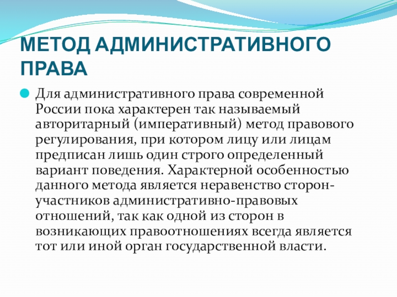 лицам предписан лишь один строго определенный вариант поведения. Характерной особенностью данного метода является неравенство сторон-участников административно-правовых отношений, так как одной из сторон в возникающих правоотношениях всегда является тот или иной орган государственной власти.