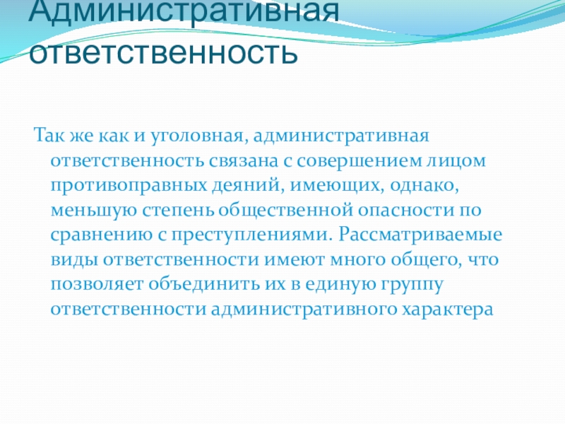 Административная ответственность Так же как и уголовная, административная ответственность связана с совершением лицом противоправных деяний, имеющих, однако,