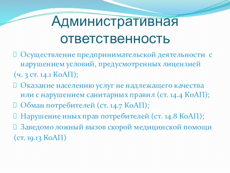 Административная ответственностьОсуществление предпринимательской деятельности с нарушением условий, предусмотренных лицензией (ч. 3 ст. 14.1 КоАП);Оказание населению услуг не