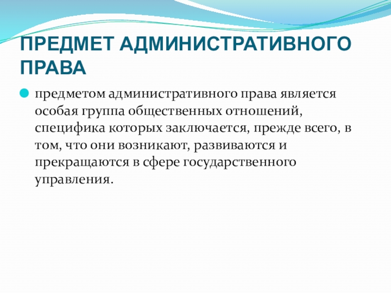 Предмет административного правапредметом административного права является особая группа общественных отношений, специфика которых заключается, прежде всего, в том, что они возникают, развиваются и прекращаются в сфере государственного управления.
