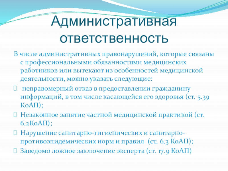 Административная ответственностьВ числе административных правонарушений, которые связаны с профессиональными обязанностями медицинских работников или вытекают из особенностей медицинской