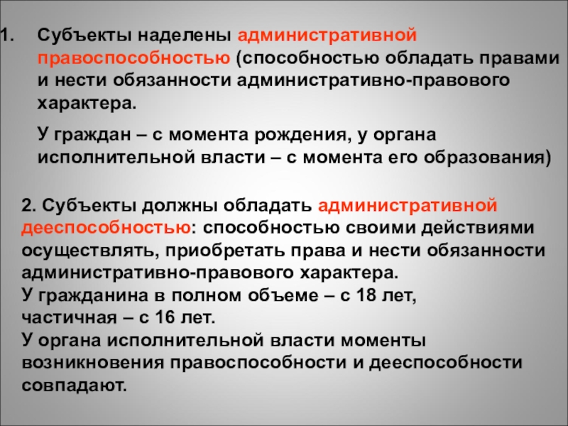2. Субъекты должны обладать административной дееспособностью: способностью своими действиями осуществлять, приобретать права и нести обязанности административно-правового характера. У гражданина в полном объеме – с 18 лет, частичная – с 16 лет. У органа исполнительной власти моменты возникновения правоспособности и дееспособности совпадают.
