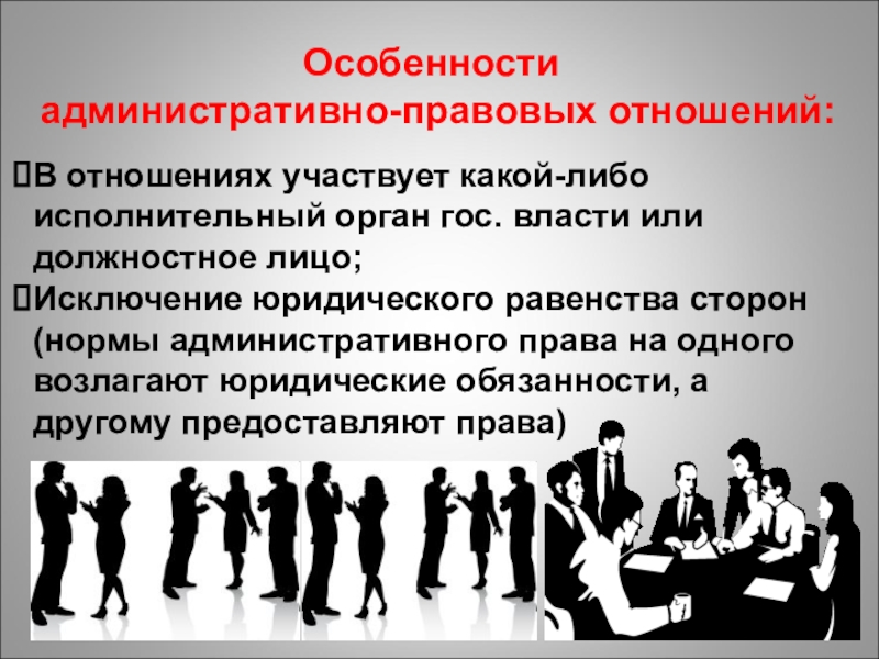 Исключение юридического равенства сторон (нормы административного права на одного возлагают юридические обязанности, а другому предоставляют права)