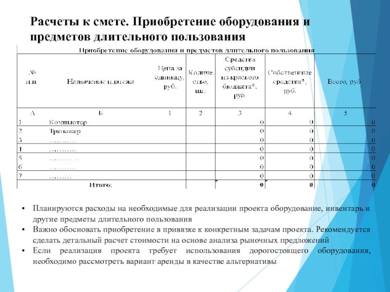 Слайд 48Расчеты к смете. Приобретение оборудования и предметов длительного пользования