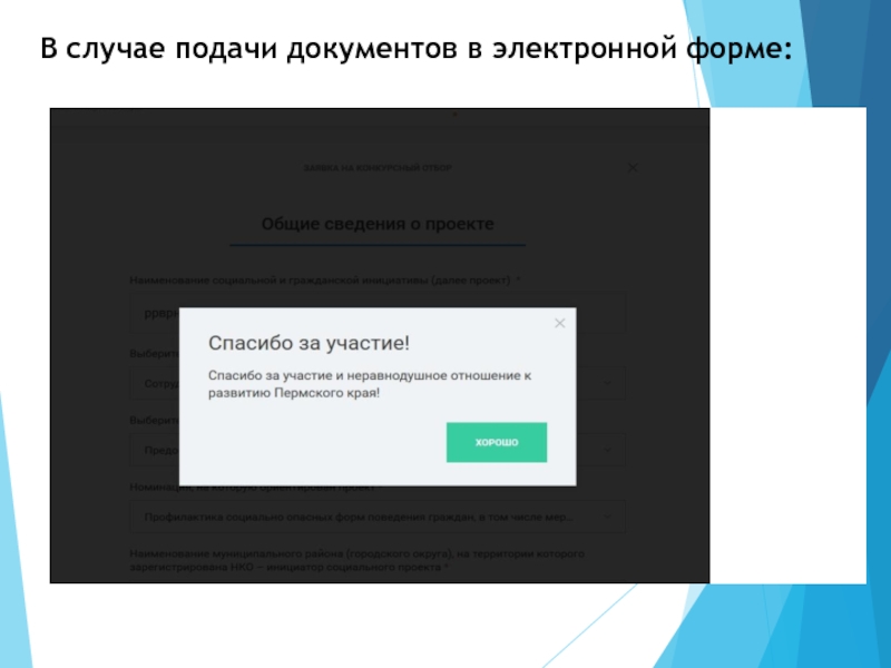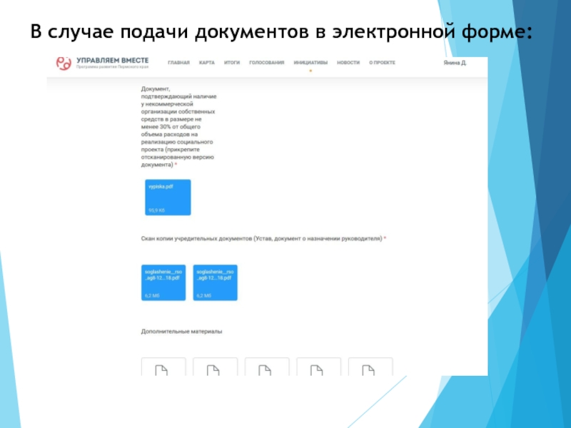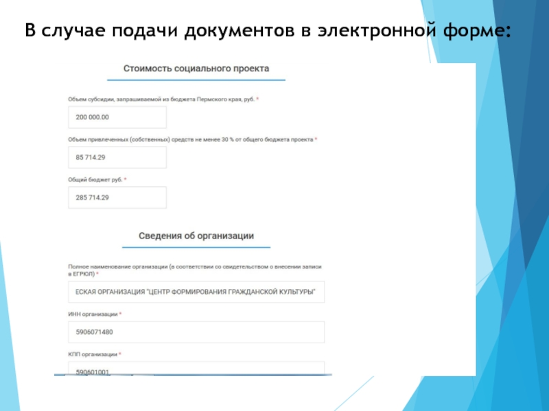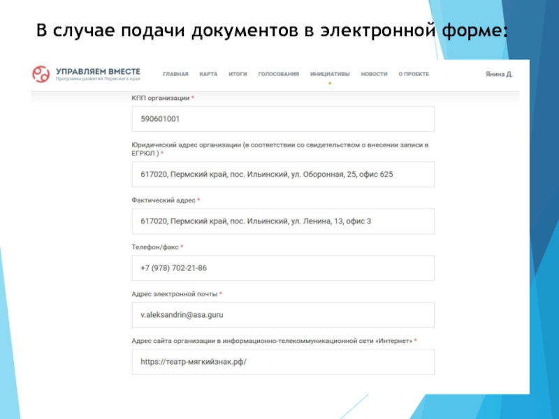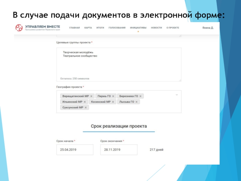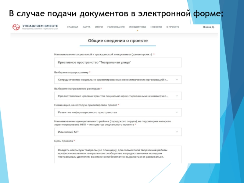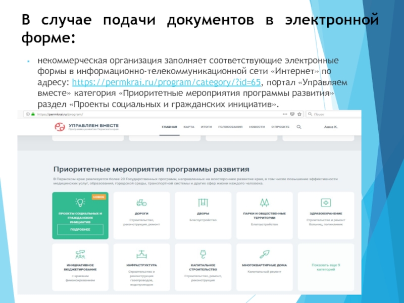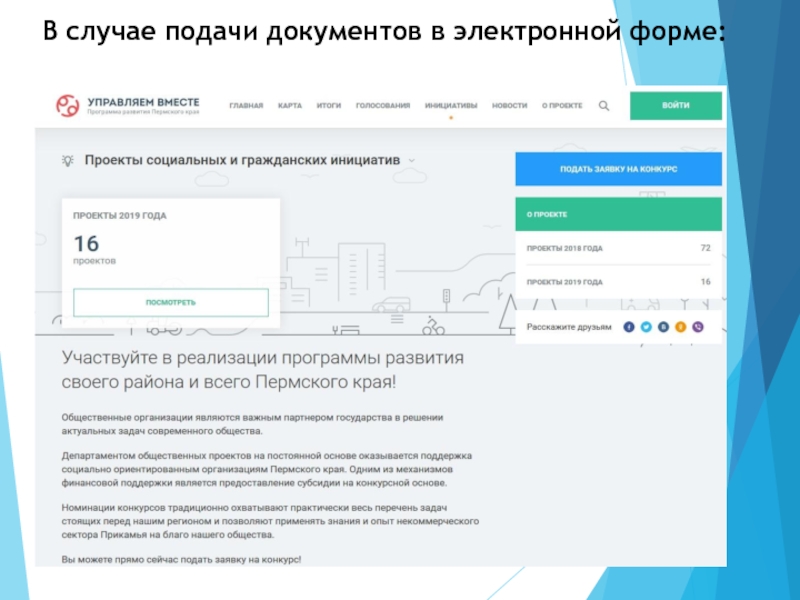 в электронной форме: в информационно-телекоммуникационной сети «Интернет» по адресу: https://permkrai.ru/program/category/?id=65, портал «Управляем вместе» » категория «Приоритетные мероприятия программы развития» раздел «Проекты социальных и гражданских инициатив».