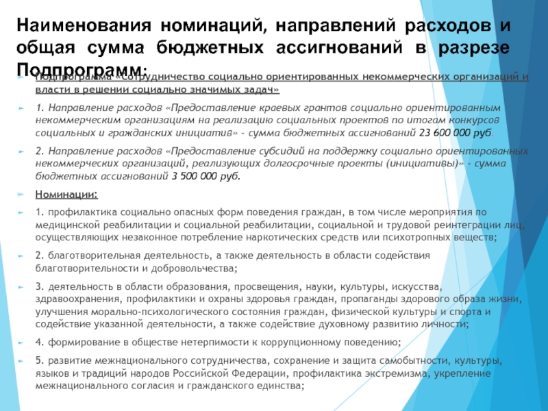 1. Направление расходов «Предоставление краевых грантов социально ориентированным некоммерческим организациям на реализацию социальных проектов по итогам конкурсов социальных и гражданских инициатив» - сумма бюджетных ассигнований 23 600 000 руб.