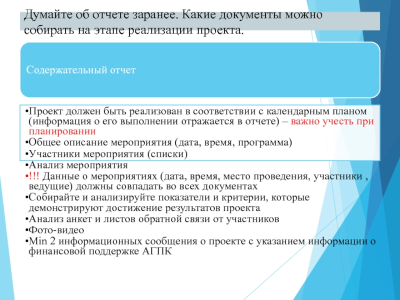 Слайд 57Думайте об отчете заранее. Какие документы можно собирать на этапе