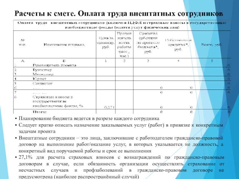 Слайд 46Расчеты к смете. Оплата труда внештатных сотрудников