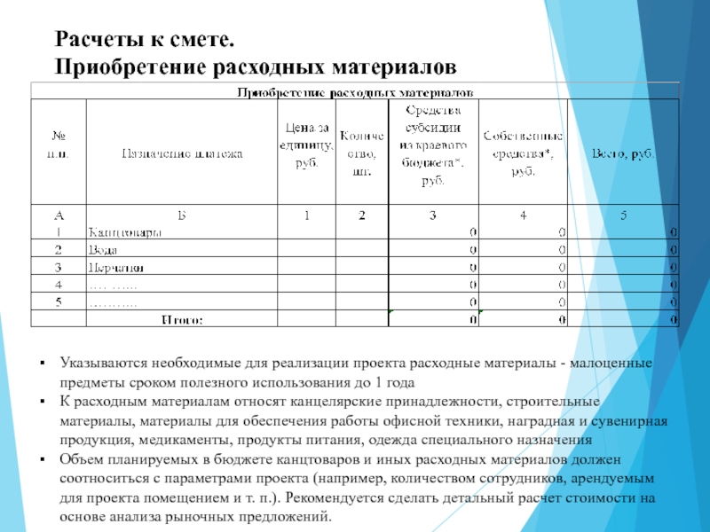 Объем планируемых в бюджете канцтоваров и иных расходных материалов должен соотноситься с параметрами проекта (например, количеством сотрудников, арендуемым для проекта помещением и т. п.). Рекомендуется сделать детальный расчет стоимости на основе анализа рыночных предложений.