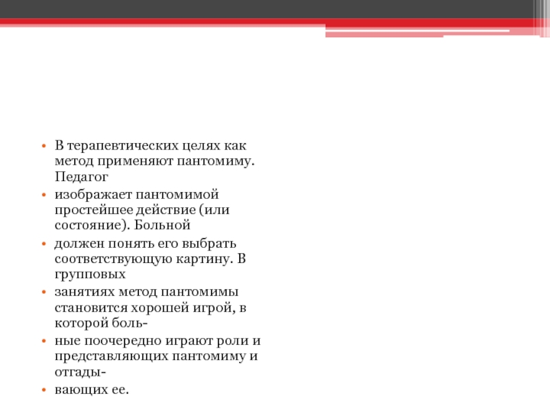 Слайд 10В терапевтических целях как метод применяют пантомиму. Педагог