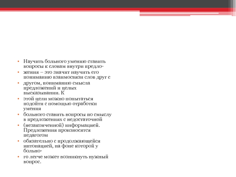 Слайд 89Научить больного умению ставить вопросы к словам внутри предло-