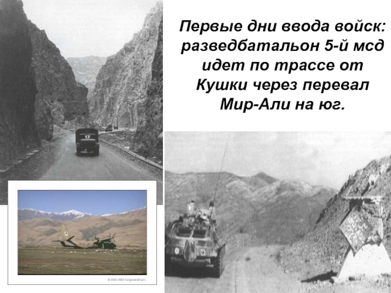 Слайд 7Первые дни ввода войск: разведбатальон 5-й мсд идет по трассе