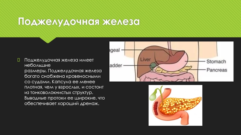 Поджелудочная железаПоджелудочная железа имеет небольшие размеры. Поджелудочная железа богато снабжена кровеносными со судами. Капсула ее менее плотная, чем