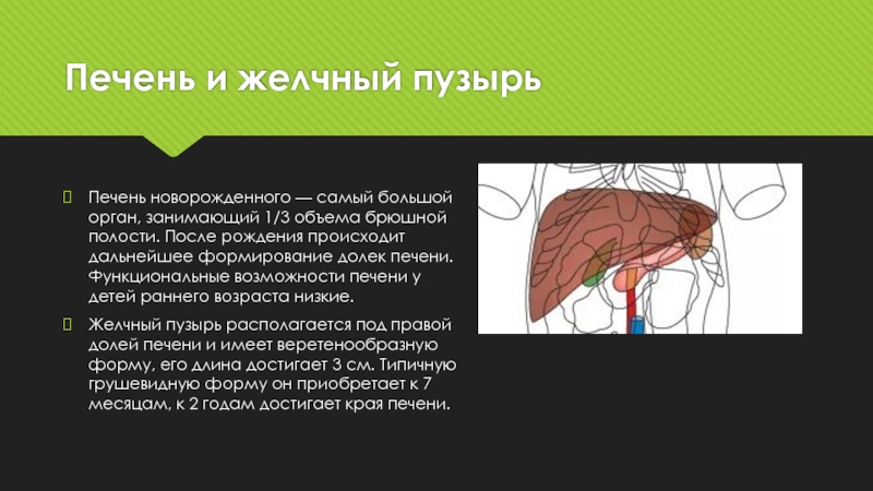 Печень и желчный пузырьПечень новорожденного — самый большой орган, занимающий 1/3 объема брюшной полости. После рождения происходит дальнейшее