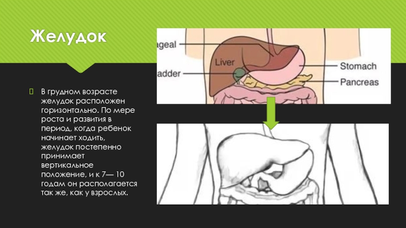 Желудок В грудном возрасте желудок расположен горизонтально. По мере роста и развития в период, когда ребенок начинает ходить,